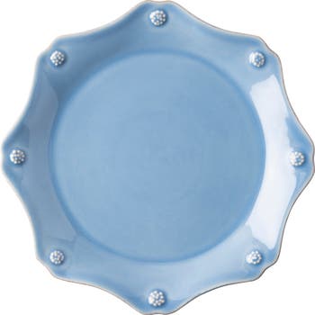Glazed ceramic embellished with Juliska's signature berry-and-thread motif adds to the vintage charm of a ceramic plate that's perfect for salads and desserts.