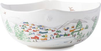 Juliska's iconic Berry & Thread motif details a snowy, scalloped stoneware bowl hand-illustrated with festive holiday scenes of the folkloric North Pole.