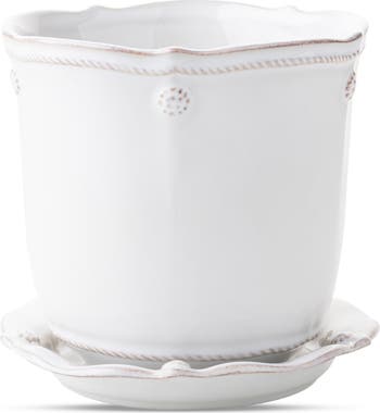 Evoking a vintage charm, this ceramic planter and saucer crafted in Portugal are beautifully detailed with berries and thread along their sculptural edges.
