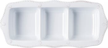 Scalloped edges and a signature berry-and-thread pattern bring subtle whimsy to an elegant serving tray crafted from milky melamine and boasting three sections.