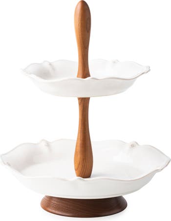 A classic whitewash-glazed ceramic stand with dual tiers is trimmed with Juliska's delicate berry and thread motif for an Old World French feel. Finished with a handle and foot in rich ash wood, it serves as a striking centerpiece filled with ripe fruits or luscious confections.