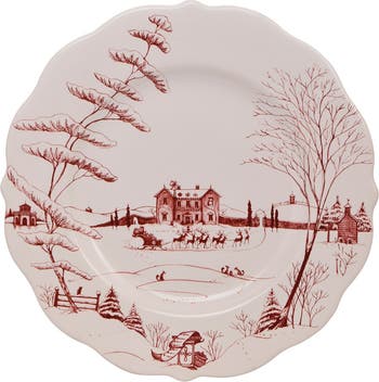 A picturesque wintertime image adds to the vintage charm of a scalloped ceramic dinner plate that's perfect for any holiday fête.