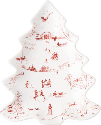 Elevate your holiday dinner party with this beautiful tree-shaped ceramic platter featuring a playful winter scene.