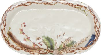 A striking hostess tray crafted from glazed ceramic is embellished with a lovely painted rim of twining vines, ripe wheat stalks, clustered berries and sleek feathers. Whether you use it as a catchall on the counter or a display for delectables, the tray makes a gorgeous design accent.