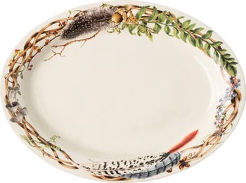 A striking oval platter crafted from glazed ceramic is embellished with a lovely rim of painted twigs, twining vines and speckled feathers. Use this distinctive foundation piece to display a traditional roast for the holidays or a delectable charcuterie spread for a cocktail party.