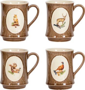 Hand-painted with friendly forest creatures framed in earthy woodgrain, this set of creamy-ceramic mugs adds a rustic touch to your favorite warm beverages.