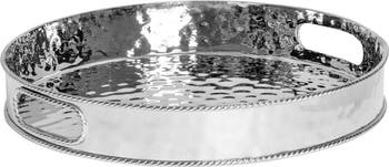 A hand-hammered finish enhances a stainless steel serving tray accented with rope detailing that's perfect for serving up drinks or hors d'oeuvres.