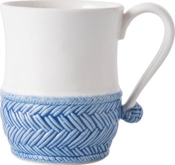 A gracefully contoured mug crafted from whitewashed ceramic features Juliska's signature French basket-weave motif trimmed in a timeless Delft blue. Unlike vintage finds, it can be safely moved from freezer to microwave, then right into the dishwasher for easy cleanup.
