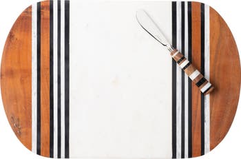 Stripes of hand-marbled resin add artisanal refinement to the dappled, rustic textures of a distinctive serving set crafted from full-grained Acacia wood.