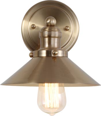 Like a classic barn light but in a modern shape and smaller scale, this classic design features a metal cone shade that conceals the top half of the bulb -- perfect for a clean, industrial look. In metal finish, this sconce is perfectly at home above a bathroom mirror or as extra lighting in kitchens, where your hardware truly shines. Also available in multi-light configurations, the geometric shape adds elegant interest to any space.