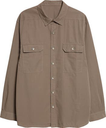 This roomy cotton shirt with dropped shoulders fits comfortably over a base layer for versatile wear. The deep flap pockets and silvertone tack buttons lend a subtle utility aesthetic, while the level shoulder shoulder seams bring signature Rick Owens style.