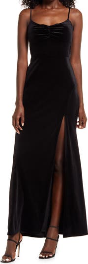 Make a head-turning entrance in this velvet gown featuring a front slit and chic back cutouts.