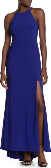 Step out in a simply classic evening gown featuring a chic halter neck, a keyhole back and a pooled hemline with a daring thigh-high slit.