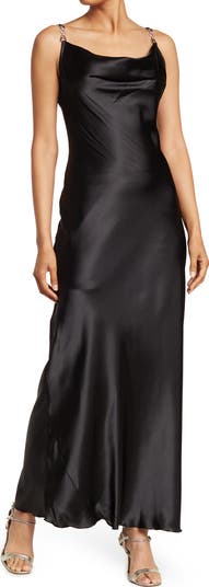 Mix and match your favorite pumps with this long slip dress featuring smooth satin with a beautiful drape.