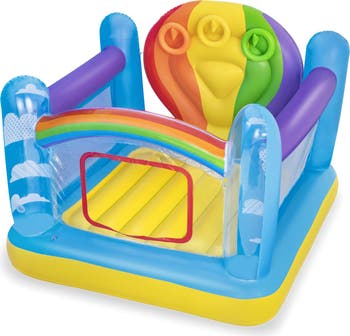 For indoor and outdoor use Develops: - Fine Motor Skills: helps your child develop hand-eye coordination and basic levels of dexterity - Gross Motor Skills: stimulates your child’s ability to get up and move around, gaining control of their bodies and movement - Imagination: encourages your child to dream of new ways to see the world around them - Confidence & Communication: promotes your child’s self-esteem through interactive play Mesh sidewalls for parent visibility Colorful, interactive rainbow bouncer Ring toss game with built-in sidewall hooks 3 inflatable rings included Contents: 1 bouncer, 3 inflatable rings, repair patch. WARNING! USE ONLY UNDER COMPENENT SUPERVISION. KEEP AWAY FROM FIRE AND FLAME.