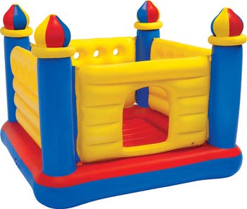 Jump, jump, pretend, play and jump some more! The Castle Jump-O-Lene is the ultimate inflatable kids trampoline combined with an imaginative pretend-play castle setting. Cushiony, double-mattress inflatable floor for safe, soft, bouncing fun! Can accommodate up to two jumpers with a combined weight of 120 pounds maximum. Approximate dimensions of 69 inches x 69 inches. Built-in crawl-thru door included so your kids can use the Castle Jump-O-Lene as a playhouse or a big fort. Let your kids' imaginations soar! Recommended for ages 3 and up. WARNING: CHOKING HAZARD -- Small parts. Not for children under 3 yrs.