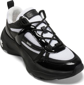 Patent overlays and breathable mesh create attractive contrast on this sporty sneaker set on an extrachunky sole.