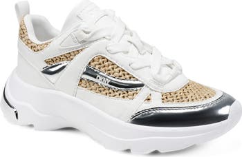 Woven and metallic accents bring playful mixed-media elements to this street-chic sneaker grounded by a chunky sole.