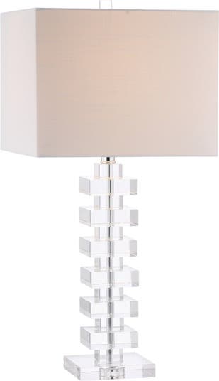 Modern yet timeless, the geometric crystal cubes on the base of this 28" high table lamp will bring a touch of glam and extra light to any dim corner. At nearly 30" tall, you can make a statement by adding a pair on either side of a console or buffet, or use a single lamp to give your desk the designer touch with this updated take on a classic style. Crafted of crystal, it's finished with a bright white drum shade and coordinating finial.