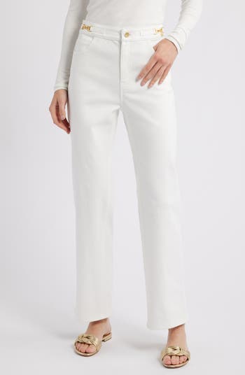 Chic goldtone chains and charms accent the waist of classic denim jeans that are rendered in a bright shade of white for a resort-ready look.