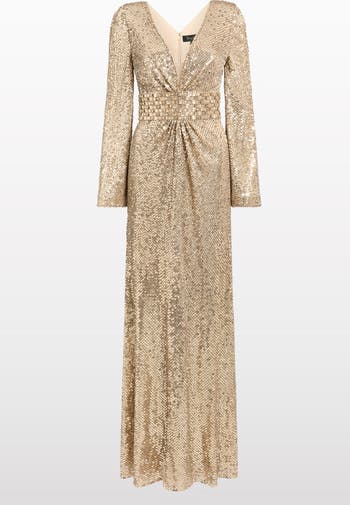 This evening gown is a refined expression of glamour, featuring a plunging V-neckline and long fitted sleeves that create a sleek, elongated silhouette. The cinched waistline is accentuated with intricate embellishment, adding structure and subtle drama to the design. Fully adorned in sequins, it catches the light with every movement for an effortlessly radiant finish. Perfect for black-tie events, gala dinners, or red carpet occasions, this gown ensures timeless elegance with a modern edge.