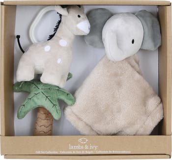 - Includes an elephant security blanket / lovey, an adorable giraffe stroller toy, and a cute palm tree mini plush toy with crinkle leaves