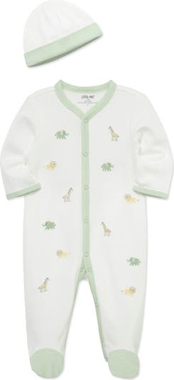 Favorite wild animals are embroidered on a supersoft cotton footie and hat set that'll keep baby covered from head to toe.
