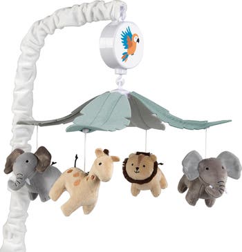One light cream velour giraffe, two gray velour elephants and one cream velour lion circle around this charming musical mobile. A canopy of four leaves add to this jungle adventure. A cream velour scrunchie covers the mobile arm and the music box is decorated with a yellow and teal bird. This battery operated musical mobile plays nursery songs for 20 minutes, has an on/off switch and volume control. It plays Brahms Lullaby, Twinkle Twinkle Little Star and Rock a Bye Baby. Requires 3 AAA batteries not included.