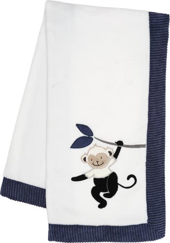 Your little adventurer will be warm and cozy with this super soft fleece blanket. Perfectly sized at 30” x 40” for cuddling. It is made in a lovely white high pile polyester faux fur with a ribbed navy velour border. An appliqued monkey is on the lower right corner holding onto a tree branch with two navy leaves. The monkey’s upper body is made in a high pile polyester faux fur and his face and lower body are velour. This blanket makes a great baby shower gift or welcome home baby gift.
