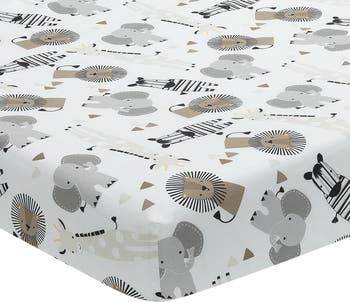 - This soft 100% cotton, breathable fitted baby crib/toddler sheet features a gender neutral tossed animal print including elephants, lions, zebras and giraffes on a white background. Perfect for any baby boy or girl nursery.