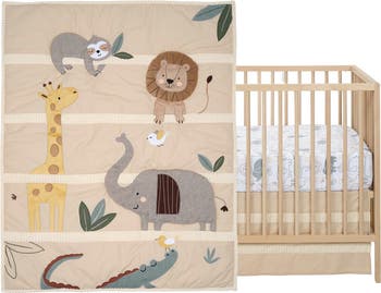 This three-piece baby crib bedding set features friendly jungle safari animals with playful details on a soft, neutral beige/tan/gray color palette. The bedding set includes one quilt, one breathable 100% cotton fitted crib sheet, and one crib skirt. Our fully appliqued quilt features a golden faux suede giraffe, a taupe minky velour lion, a gray boucle elephant with brown corduroy ears, a sleepy curly boucle sloth, and a dusty green soft textured alligator. There are four rows of textured creamy ribbed velour in between these happy jungle animals. The front and back of the quilt is a poly/cotton twill. This quilt, with so many textured animals, is perfect for tummy time with your little one and makes a great play mat. The breathable 100% cotton fitted crib sheet is on a white ground with gray elephants, lions, giraffes, and alligators in multi-colored silhouettes. The fitted crib sheet has elastic all the way around for a safe and secure fit on a standard size crib mattress. The decorative crib skirt is a natural sand color in a poly cotton twill. The front panel is decorated with two rows of creamy ribbed velour and has a 14 ½” drop. This crib skirt adds the finishing touch to your child’s crib.