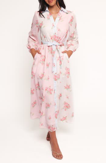 A bow-tie belt sweetens the silhouette of this polished maxi shirtdress romanced by bouquets of roses.