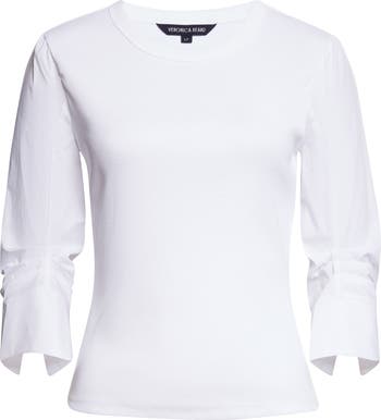 Gathered poplin sleeves add a shirt-like element to this knit top made from soft stretch cotton.