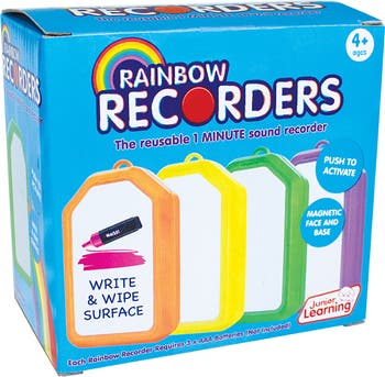 The Junior Learning Rainbow Recorders set includes four colorful recorders designed to help children develop speaking, listening, and memory skills through fun, interactive play. Each recorder can capture up to one minute of sound, allowing kids to record words, songs, or reminders and play them back to reinforce learning. The recorders feature a write-and-wipe surface for labeling, a magnetic face and base for easy display on whiteboards or metal surfaces, and a space for photo personalization. Perfect for classrooms, therapy sessions, and home learning, Rainbow Recorders support creative activities such as storytelling, pronunciation practice, quizzes, and treasure hunts. Recommended for ages 4 and up.