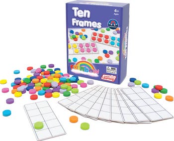 This set of magnetic ten frames is an ideal learning aid to provide a visual learning opportunity for students to grasp essential math concepts as well as helping them understand how numbers are composed of tens and ones. The ten frame concept can help reinforce or teach numbers, addition, subtraction, counting, number bonds, doubling, halving, and multiplication. Ten Frames are 2" x 5" rectangular frames in which you can place counters to illustrate numbers up to 10. By combining multiple ten frames, students can explore numbers beyond ten. Comes in a handy storage box with 10 frames and 100 colored counters. Appropriate for ages 4 years and up.