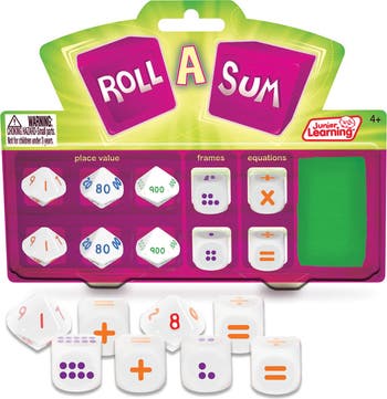 Help children develop mental calculation and counting with Roll A Sum dice. Simply roll the dice and let the numbers guide your counting. Firstly roll the dice and look at the upper face, then group the dice together that are related. Choose the dice you want to use and the best dice to start your sum. Contains 10 dice and 1 carry sack. Ages 4-9 yrs. WARNING: CHOKING HAZARD - SMALL PARTS. Not for children under 3 yrs.