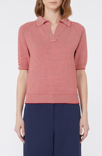 A jaunty collar and cheery stripes define a summery sweater knit with short sleeves from lightweight cotton.