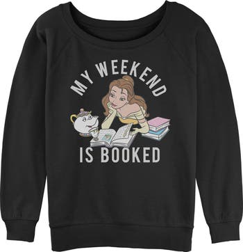 - Strut your stuff with this stylish Juniors' Wide Neck Sweatshirt with 3/4 length sleeves, that is perfect for every occasion! Featuring Belle, Chip, and Mrs. Potts reading a book along with the text: "My Weekend Is Booked" printed in bold white font.
