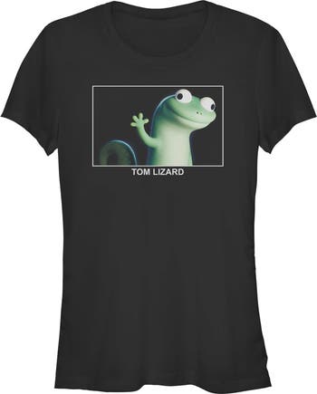 - Strut your stuff with this stylish new juniors' t-shirt that is perfect for the whole family! Featuring a fun photo of Tom Lizard happily waving at you with his name printed in white lettering beneath.