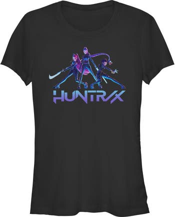 - Unleash your inner idol with this eye-catching juniors' t-shirt perfect for concerts, hangouts, or everyday slaying! Featuring Mira, Rumi, and Zoey in their battle outfit and the Huntrix logo printed across the front.