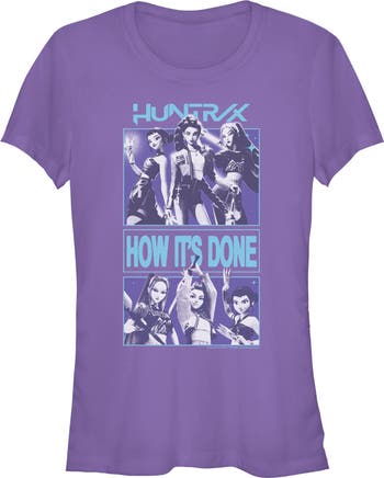 Prepare for debut with these incredible designs from the new, top-charting Netflix Film: K-Pop Demon Hunters! Dance to Soda Pop or Takedown with this Juniors' Huntrix How It's Done Graphic T-shirt featuring striking purple panels of Rumi, Mira, and Zoey, along with the song title How It's Done and the band's logo in a bold, blue font. These designs are going to be everything you can think of, so gear up to take all demons down while looking like the greatest idol the world has ever seen with out-of-this-world, officially licensed K-Pop Demon Hunters apparel!