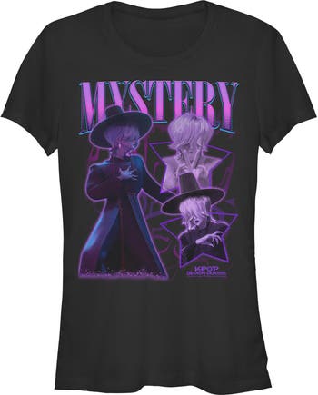 - Unleash your inner idol with this eye-catching juniors' t-shirt perfect for concerts, hangouts, or everyday slaying! Featuring a colorful collage of Mystery from K-pop Demon Hunters printed across the front.