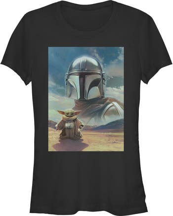 - Protect the galaxy with this juniors' t-shirt that will look perfect alongside the New Republic! Featuring a poster of Grogu and The Mandalorian printed across the front
