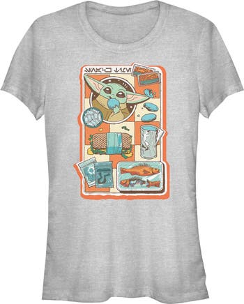 - Protect the galaxy with this juniors' t-shirt that will look perfect alongside the New Republic! Featuring a colorful collage of Grogu surrounded by food as he snacks on a small meal printed on the front.