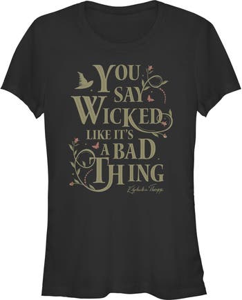 - Real style and friendship are truly unlimited with this new juniors' t-shirt that is perfect for whenever you're feeling a little defiant! Featuring Elphaba's iconic phrase, "You Say Wicked Like It's a Bad Thing," adorned with flowers and butterflies across the front.