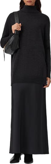 Slim straps tether this satiny maxi dress that's just right for cool weather thanks to the matched turtleneck sweater you can take off when the evening festivities start.