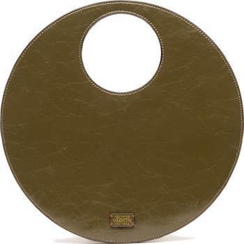 Slim enough to stand out, this circular crossbody bag is fashioned from richly crinkled leather with cutout top handles and a removable crossbody strap.