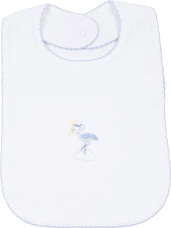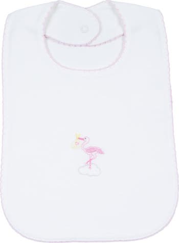 Add a touch of timeless charm to your little one's wardrobe with this 100% Pima cotton bib, crafted for softness and comfort. Featuring a beautifully hand-embroidered stork design and delicate contrast trim, it's the perfect accessory to complement our classic layette collection.