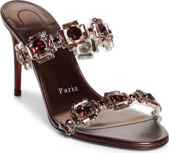 Bejeweled straps enhance the light-catching elegance of a bronze-hued stiletto sandal set on a signature red sole.