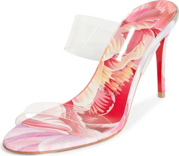 Barely there transparent straps create the illusion of walking on air in this stiletto-lifted slide featuring a tropical frond-patterned footbed and house-signature Loubi-red sole.